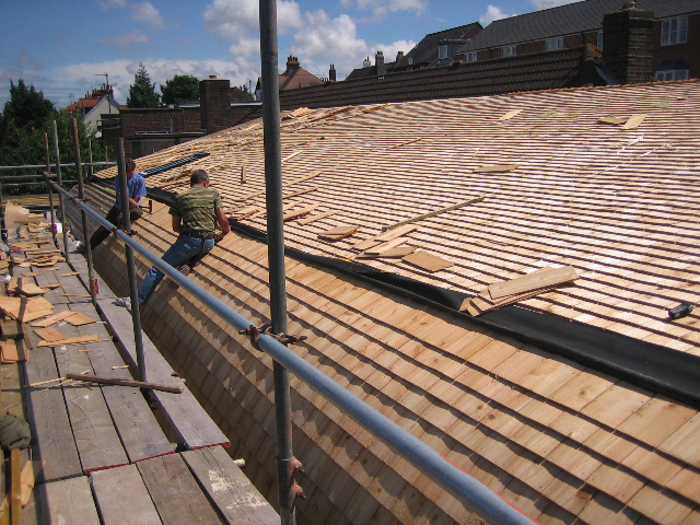 The cedar shingles cladding freshly completed on the St Pancras’s front facade. In the front the nature garden