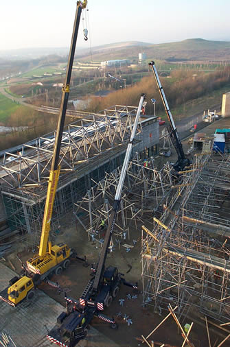 The architects had envisaged the Solar Canopy going up on 5 trusses. The carpenters came up with a solution which involved three much larger sections resting on a scaffold cradle, which were then lifted by two large cranes. Such rationalising of solutions cut this section of the work schedule by half, to one month, whilst the total erection took six weeks. This intricate piece of work involved two large sections, each covering a third of the groundspace, and each being raised one by one. The concrete supports went in first, in a sea of scaffolding, although the wooden supports had already been raised. The flanges were cut out of the steel, using a similar quality control system, which Carpenter Oak and Woodland used to track each piece of timber.