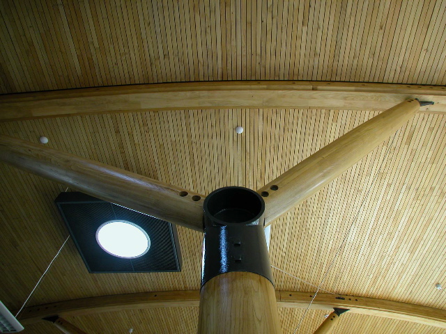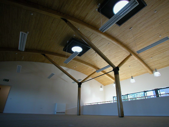 [Left] – The Bridge’s main hall with its chestnut glulam post and beams developed by In-Wood Developments [Right] – Connectors for the Bridge’s chestnut glulam system