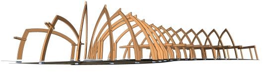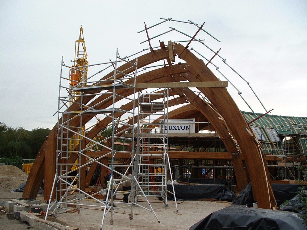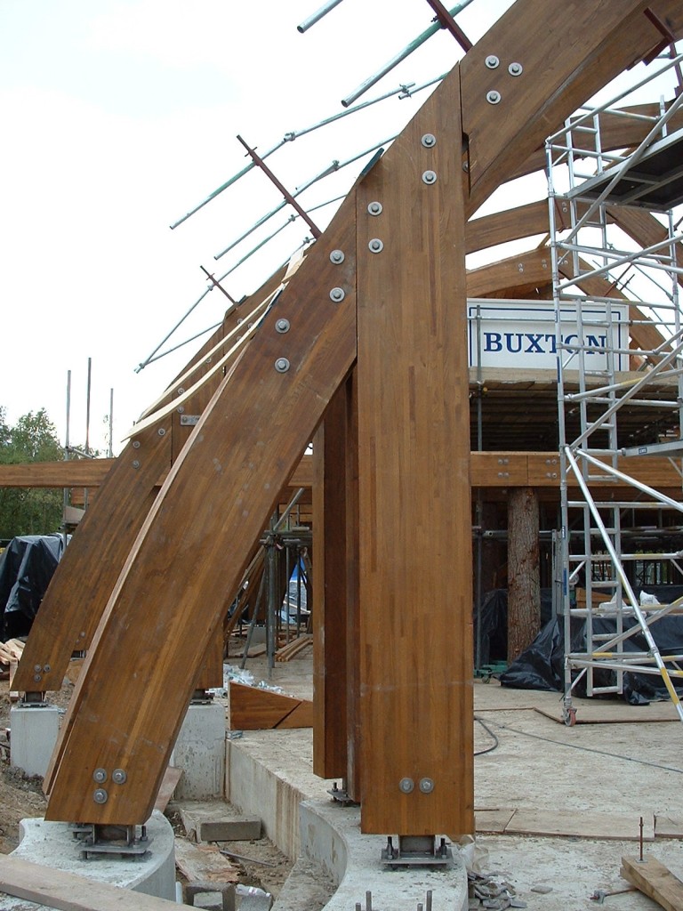 Inwood Developments were to produce the buildings engineered chestnut, and have since gone on to develop chestnut glulam as part of their suite of chestnut materials, but in 2002 the wood had not been sufficiently tested for its load-bearing and other structural properties. As part of the Shorne Wood project five glulam beams from 18 year old chestnut were therefore dispatched to the Building Research Establishment (BRE) and tested to destruction, revealing both a surprising extra degree of both flexibility and elasticity than had been assumed would result. This gave the required green light for chestnut glulam going into production, the resulting research today publically available on the BRE site. In-Wood’s glulam production has been heading upwards ever since. The architects, Inwood and engineers Faber Maunsell next developed a hinge system for the cruck-frame; designing 32 identically shaped glulam beams, joined by a hinge not unlike those found on pairs of scissors, making it possible to open and close the beams and vary the undulating ridge of the building. Faber Maunsell also provided sixteen different steel connectors, allowing for the frames natural movement, as found in all timber structures.