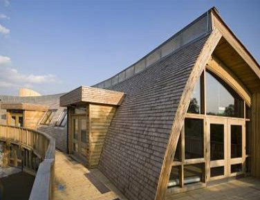 Another showcase for the growing number of examples of buildings applying locally sourced materials to a timberbuild design that stand out today is Shorne Wood’s Visitor Centre. The centre evokes an organic aesthetic, with a beautiful curved roofline clad in cedar shingles, a spacious interior acting as restaurant and interpretation centre, as well as a first floor environmental education/conference space and mezzanine with office and admin rooms.
