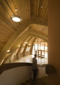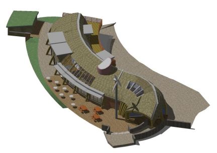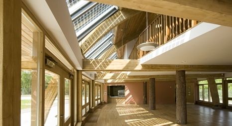 The ground floor interpretation area makes full use of the building as a teaching and learning instrument to convey the sustainability issues inherent in local materials while also demonstrating their use in contemporary building. Designed by Canterbury practice Lee Evans Architects, the centre’s brief was for a ˜robust, unique and sustainable” building, which could act as an environmental exemplar for Shorne Wood and the region. Steve Johnson of the Architecture Ensemble based his earlier design of the building around a fusion of organic with more rectilinear design features; envisaging a curvilinear shell of ETFE pillows, supported by a green oak frame around rectilinear internal spaces and a main oval hall. For a number of organisational reasons Kent County Council decided to bring in the local Lee Evans Architects practice to rethink the project, who started a complete re-design through late 2004 and into 2005. This team led by Matt Hayes re-introduced chestnut as the structural material developing a fourteen beam curved cruck-frame structure, which enabled the re-versioned roof to softly slope from its entrance high point down towards the lower far face.