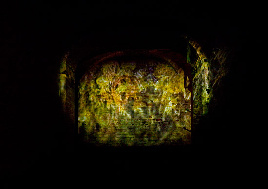 Below, Rosalyn Driscoll beautifully evokes and analyses the exhibition. Driscoll, who lives in Boston, is an artist renowned for her exploration of 'the languages of the body', and is an expert on touch. Her installations for this show drew on the classical mythology of the rivers that flowed through Hades, creating five rivers made from rawhide (which began to react to the elements in the crypt, producing a powerful smell) and two rivers delicately wrought from tissue paper. Here she begins by describing Stehlίková's projection onto the walls of the crypt: