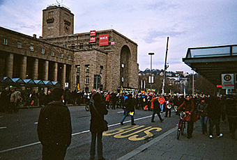 Schlossgarten next to the rail station, focused on that ur-passion of German's; their mythic connection with trees, woods and forests. The civic protests began intermittently and in small numbers in 1999, but it had only been a year earlier, when the DB's new head, Rüdiger Grube, announced that a decision on S21 would be made at the end of 2009, that the regular demonstrations in front of the station had begun. One October Monday evening a single person began a one-man protest outside the station. I am told the protests story by Hannes Rockenbauch, a young urban planner student, one of the earliest and key members of the opposition