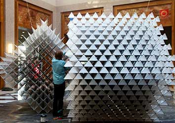 Little Shining Man, is comprised of carbon fibre rod and cube fibre, a composite fabric used for racing boat sails. The three cube kite comprises 23 000 parts, which was constructed by hand over sixteen months, employed rapid prototyping to suggestive effect. Shimmering in sunshine and translucently reflecting light the hi tech materials are both light and strong enough to allow the structure to rise up into the sky, at least, apparently, once a year when the sculpture is taken along to St Helier’s near-by St Aubin beach and put through its paces.